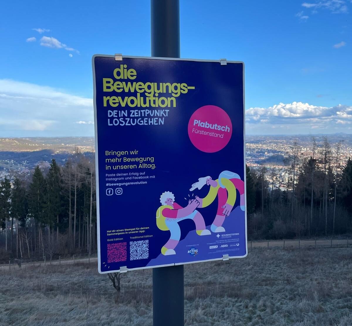 Mittlerweile wurden jene Ziele zur Tour de Steiermark im Bezirk Graz und sind dementsprechend im Design der Bewegungsrevolution beschildert. Insgesamt gibt es drei verschiedenen Touren („Traditional Edition“, „Gold Edition“ und „Yellow Edition“), die in Zusammenarbeit mit dem Verein Active City Graz erarbeitet wurden. Wie in den anderen Bezirken kannst du auch in Graz Stempel für alle drei Touren in deinem digitalen Bewegungspass über unsere kostenlose App sammeln: Einfach QR-Code auf der Tafel scannen und schon erhältst du deinen digitalen Stempel. Sobald du dir fünf Stempel an verschiedenen Gipfeln geholt hast, wartet eine kleine Überraschung auf dich.