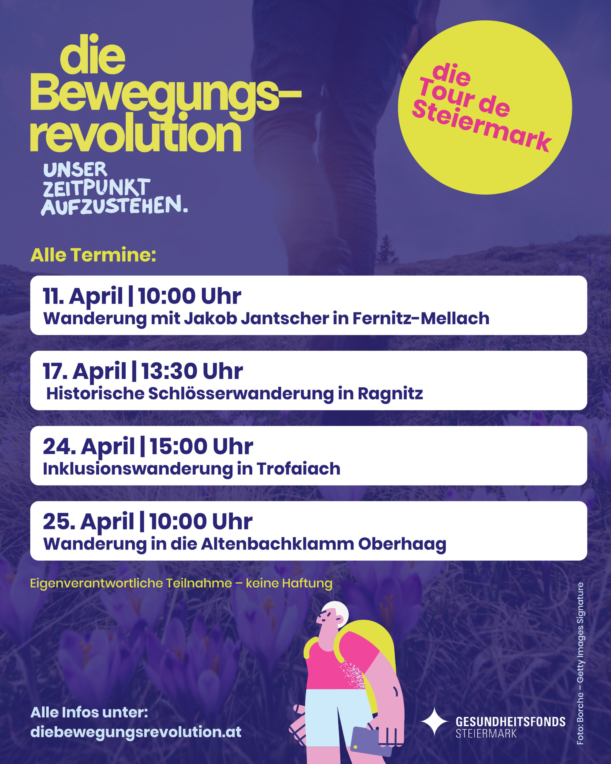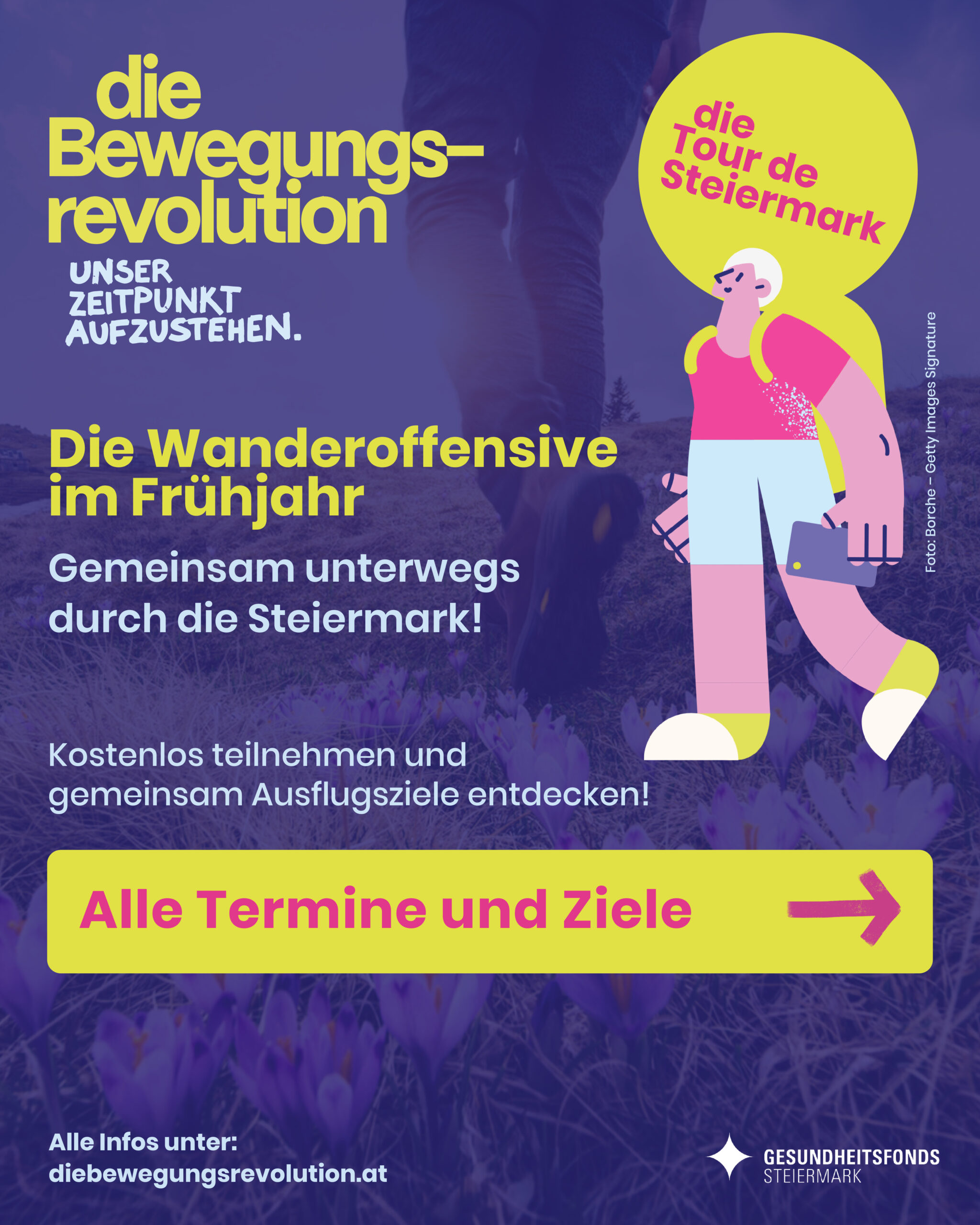 Ab 11. April heißt es: Raus in die Natur, rein ins Erlebnis! Mit der Wanderoffensive der Bewegungsrevolution wird ganz Steiermark zur Bewegungsbühne. Im Rahmen der Tour de Steiermark wartet ein einzigartiges, kostenloses Wanderprogramm, das Menschen zusammenbringt, Regionen verbindet und Lust auf Bewegung macht.